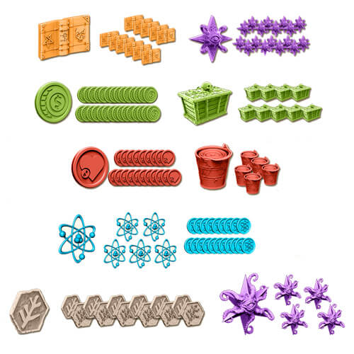 Bling for your game - this replaces ALL resources (including both elder signs and the quantum-pixel resources from the Dark Ritual box) to plastic pieces in denominations of 1 and 3!